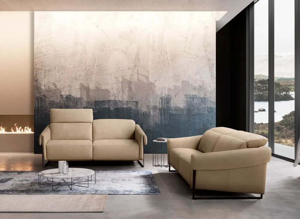 Selfie è un divano dalla personalità giovane e grintosa, la versione 3 posti è dotata di un doppio motore che permette a ogni seduta di gestire in modo indipendente la funzione recliner di spalliera e poggiapiedi. Particolare il laterale grazie al taglio inclinato del fianco bracciolo e la parte frontale del bracciolo con una mantellina che avvolge il piede a slitta. Il rivestimento in pelle effetto nabuk nei colori crema e giallo intenso.