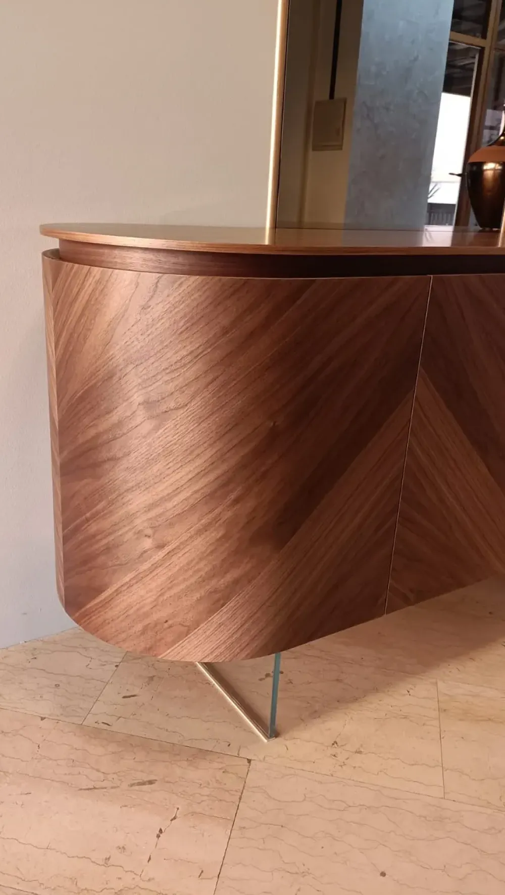 Madia mod. OPERA con fianchi curvati e ante laterali curve, realizzata completamente in essenza legno Noce Canaletto con finitura Olio – Dimensioni: Larghezza 220 cm – Altezza 80 cm – Profondità 53 cm – composta da 4 ante battenti con ripiani in vetro trasparente. Piedi di supporto in vetro trasparente. La particolarità della madia OPERA è racchiusa nell’impiallacciatura a spina di pesce che esalta la lavorazione artigianale, la madia Opera non è dotata di maniglie per non rovinare o intaccare la venatura del legno, bensì le ante sono ribassate rispetto al top e smussate sulla testa per una presa più facilitata. La madia OPERA con fianchi curvati si può avere anche con illuminazione interna e sui piedi in vetro oltre al fatto di poter richiedere il top in ceramica, con diverse finiture tra cui scegliere. E’ DISPONIBILE ANCHE IN VERSIONE RIDOTTA DI DIMENSIONI 160 CM (prezzo a richiesta) La madia OPERA è visionabile presso il nostro showroom di Limbiate, Corso Como 36 – 20812 (MB) – ARREDAMENTI ARNABOLDI SNC – 347 5426154