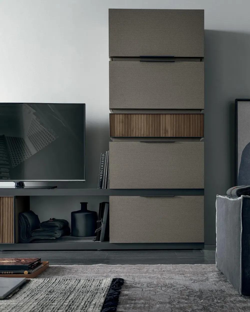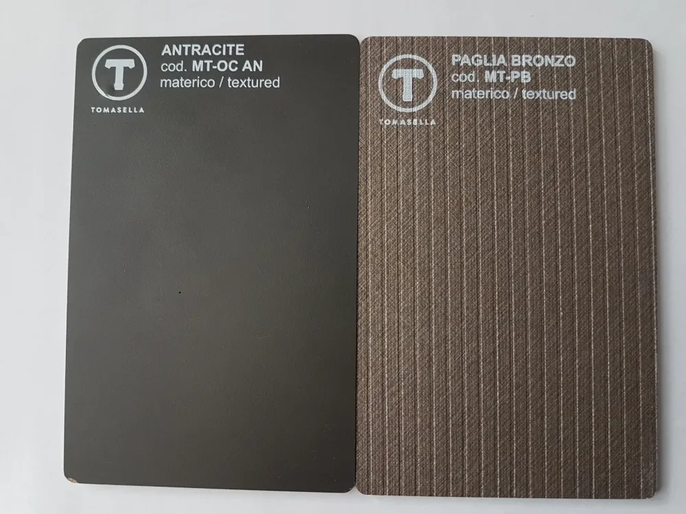 Finiture della foto: Materico paglia bronzo, materico opaco antracite, legno noce canettè e metallo antracite.