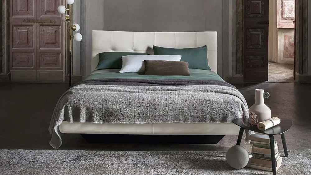 Con il letto Aurora Due, il designer Tito Agnoli dà una seducente interpretazione della notte. La testata è ampia e accogliente, scandita da una delicata lavorazione a impunture a formare un moderno capitonné che profuma d 800. Il letto Aurora Due è disponibile anche nella versione con un capiente vano contenitore. La testata è in massello di faggio leggermente imbottita, con rivestimento in Pelle Frau®. La base è imbottita in poliuretano espanso, con struttura in listellare di abete per le sponde e in multistrato di pioppo per la pediera. Negli angoli anteriori, è arricchita da un filetto in pelle. Il letto Aurora Due ha piedi posteriori ricavati dal prolungamento della testata fino a terra, mentre il basamento anteriore è in legno, con verniciatura colore nero antigraffio realizzato in un unica tavola trapezoidale che attraversa tutta la larghezza del letto. Stessa forma ma svuotata al suo interno per il basamento in metallo, disponibile nelle finiture canna di fucile o cromato. Il letto Aurora Due può ospitare un capiente vano contenitore accessibile dalla pediera frontale grazie a un dispositivo con molle a gas. In questa versione la base è attrezzata con piedi cilindrici in metallo verniciato nero. Può essere scelto con meccanismo di sollevamento singolo o doppio. In caso di meccanismo singolo il piano di riposo viene sollevato in posizione inclinata. In caso di meccanismo doppio può essere sollevato in posizione inclinata per accesso al vano contenitore o in posizione orizzontale per facilitare il rifacimento del letto. Entrambi i meccanismi sono dotati di fermo di sicurezza.