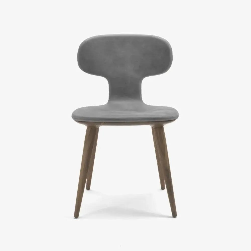 Sedia imbottita e rivestita in pelle camoscio color grigio antracite con cuciture a vista. Dalle forme sinuose ed avvolgenti, dotata di struttura sagomata in legno massello di noce finitura olio. Dimensioni L.48xP.48,5xH79,5cm. Disponibilit quantita 4.
