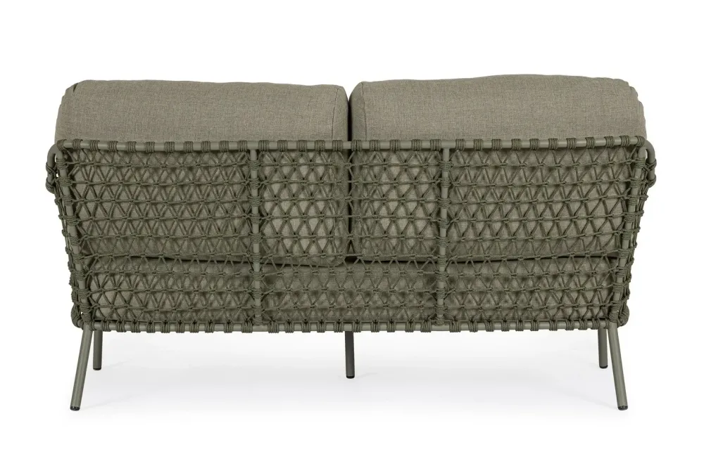 Poltrone e Divano: STRUTTURA IN ACCIAIO INOSSIDABILE (201). INTRECCIO PER ESTERNO IN CORDA (POLIPROPILENE). CUSCINI SFODERABILI IN TESSUTO IDROREPELLENTE SUNPROOF OLEFIN (100%POLYPROPYLENE). Tavolino: GAMBE IN ACCIAIO INOSSIDABILE (201). PIANO IN TEAK – SVLK (LEGNO CERTIFICATO PROVENIENTE DA FORESTE SOSTENIBILI). VITERIA IN ACCIAIO INOSSIDABILE. Misure Poltrona: Larghezza 74 cm, Profondità 85 cm, Altezza 71 cm. Misure Divano: Larghezza 165,5 cm, Profondità 85 cm, Altezza 71 cm. Misure tavolini: n.1 Diametro 60 cm, altezza 35 cm, n.2 Diametro 80 cm, altezza 30 cm.
