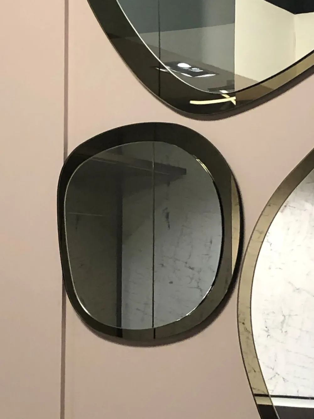 Specchio dalla forma morbida sagomata, composto da due vetri sovrapposti. Color bronzo Dimensione 45 x 46 cm Trasporto escluso
