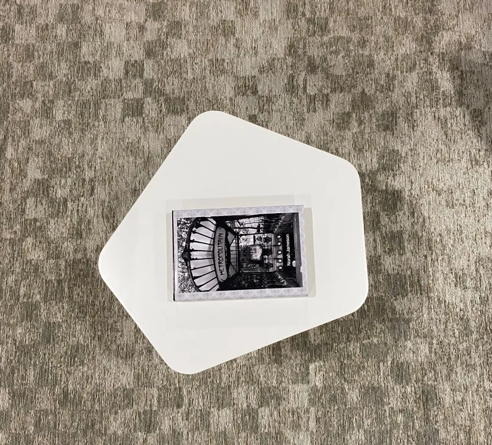 Tavolino da salotto pentagonale con struttura in metallo laccato bianco.