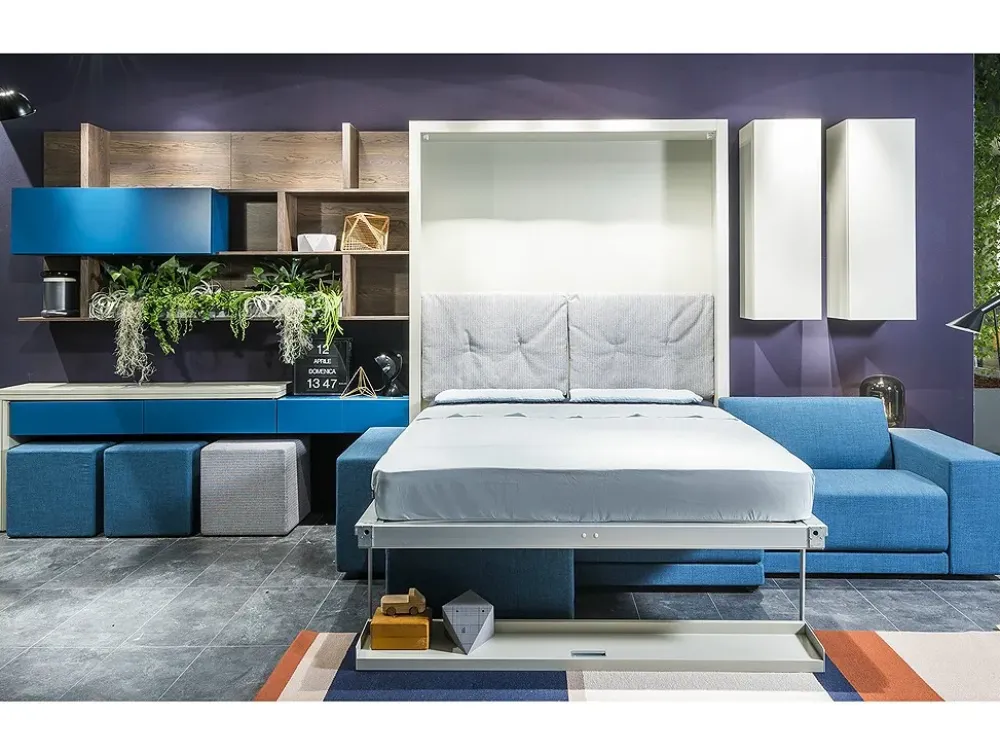 Console integrata ad elementi con cassetti o contenitore a ribalta, che si trasforma in tavolo da pranzo. L’elemento è composto da 2 piani con apertura a libro, gamba di sostegno con spalla di supporto e meccanismo rotante.