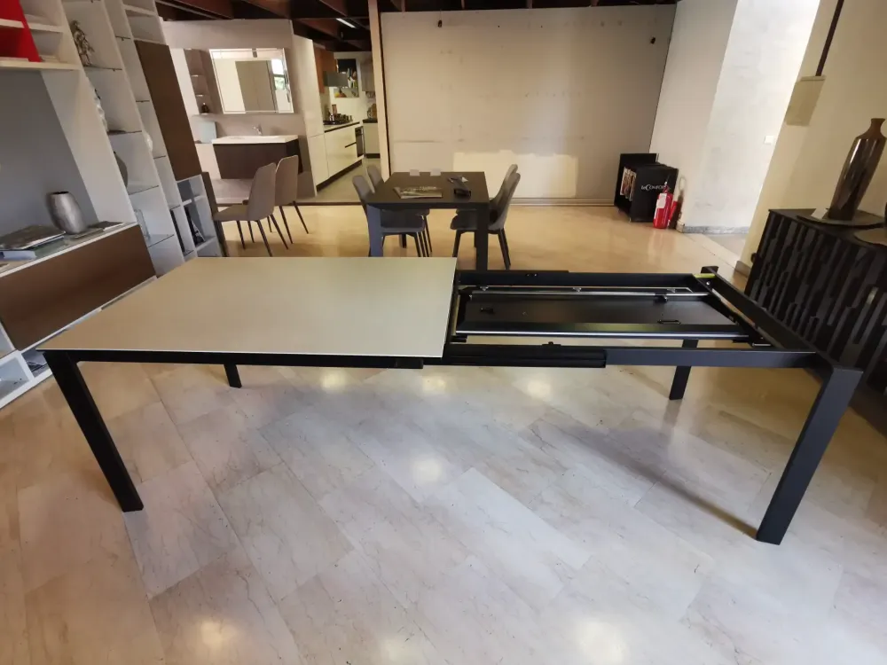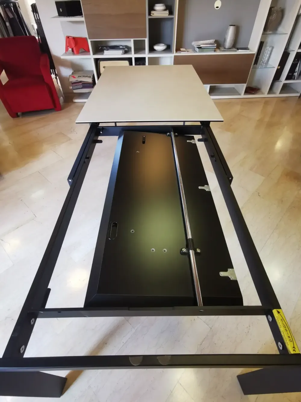 Offerta Outlet per tavolo allungabile mod. EMINENCE FAST, dimensioni tavolo 130 x 90 cm allungabile fino a 230 cm grazie al meccanismo di allunga automatico, n°1 allunga da 100 cm con apertura a libro vincolata nella struttura. Struttura in metallo verniciato “NERO OPACO P15”, piano e allunga in ceramica “SALE P5C”. La nostra offerta outlet si riferisce al tavolo in pronta consegna che si vede in foto, ma garantiamo lo stesso prezzo anche per il riordino da nuovo del tavolo EMINENCE FAST anche con possibilità di personalizzazione delle finiture. IL PREZZO SI INTENDE IVA COMPRESA E COSTO DI TRASPORTO E MONTAGGIO DA VALUTARE IN BASE ALLA DESTINAZIONE. Arredamenti Arnaboldi snc – Limbiate – 347 5426154