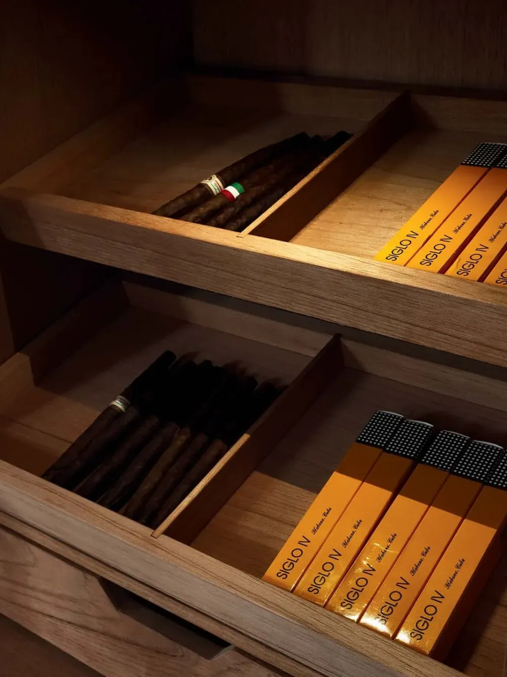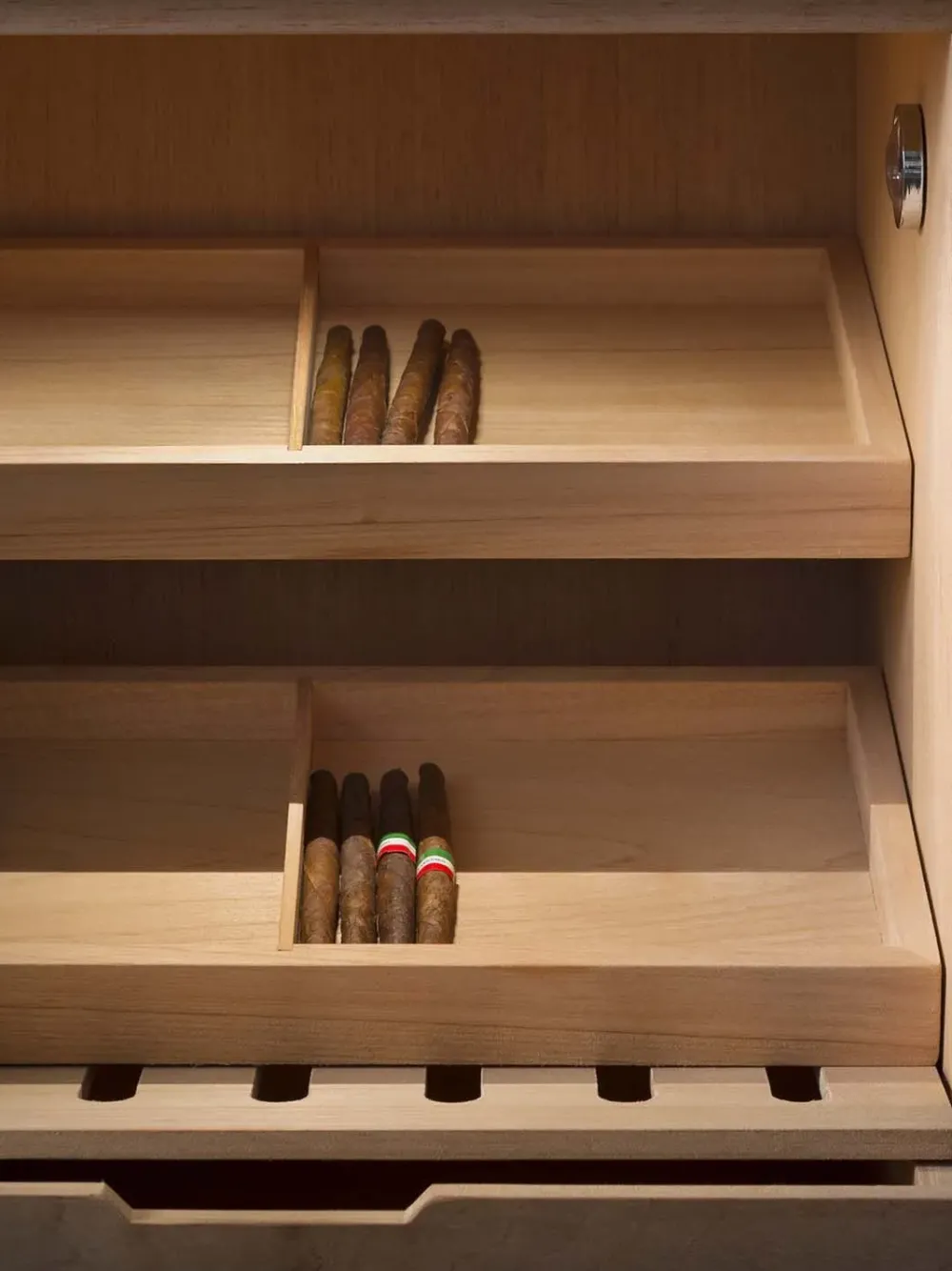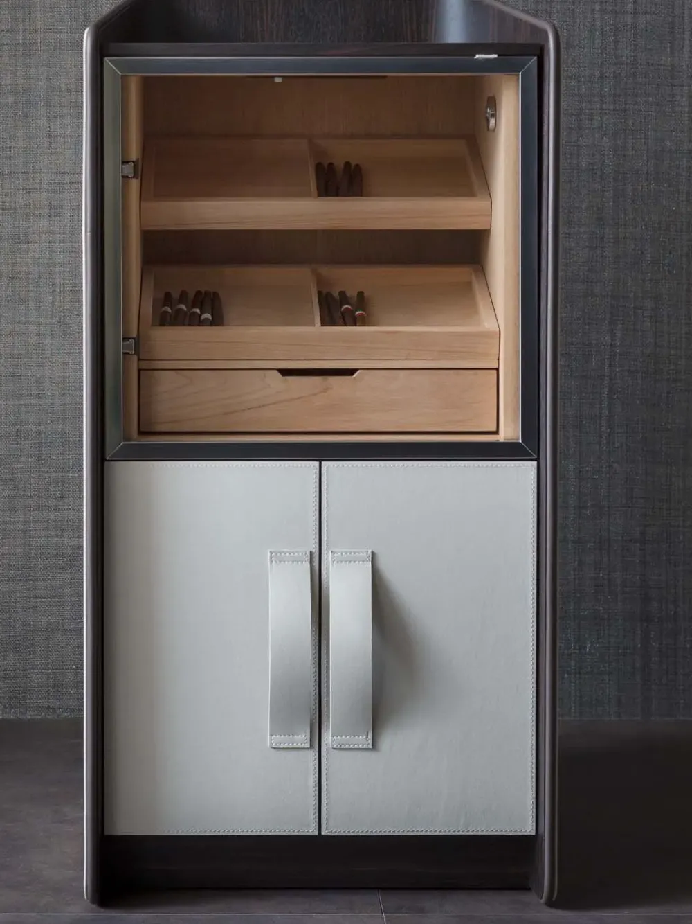 Vano superiore porta sigari rivestito in Cedro Spanish, vassoi porta sigari e cassetto umidificatore in massello di Cedro Spanish, dotato di igrometro per il controllo interno dell’umidità. Faretto interno batteria. Anta di chiusura con telaio brunito opaco e vetro temperato color Bronzo. Vano inferiore con ante e maniglie rivestite in pelle, interno in Ebano finitura opaca con faretto a batteria.