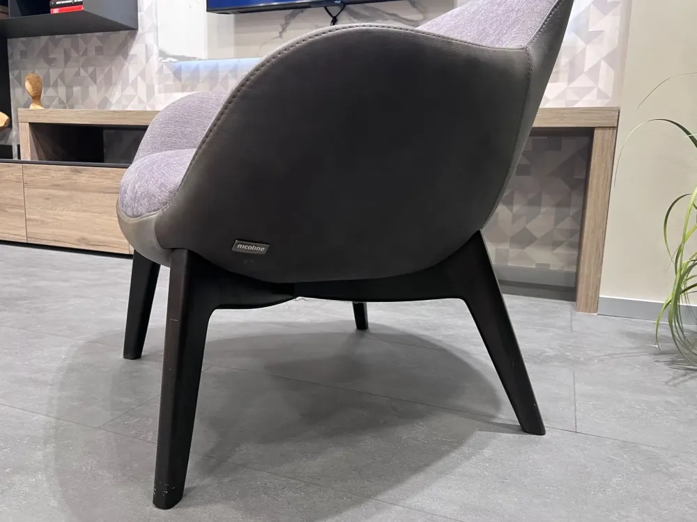 Poltrona “Ghirla” Nicoline con doppio rivestimento, scocca in pelle e interno in tessuto, basamento in legno.