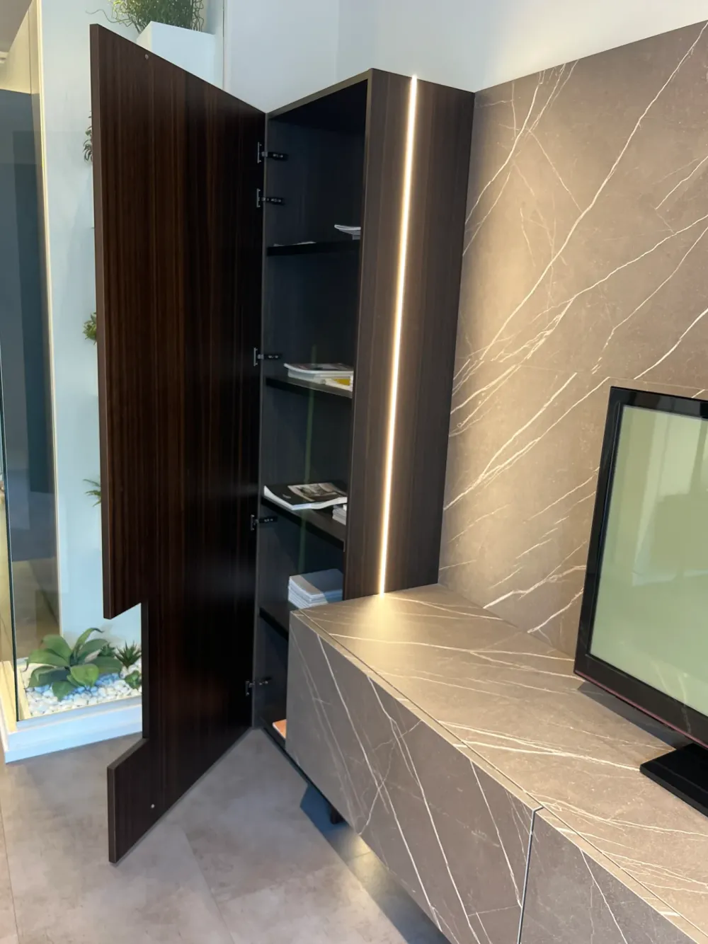 Misura larghezza cm 390 altezza cm 206 colonne in rovere termo-cotto con vano centrale sospeso in laminato effetto marmo. Illuminazione LED integrata. Colonne con ripiani, predisposizione per appendere la tv.