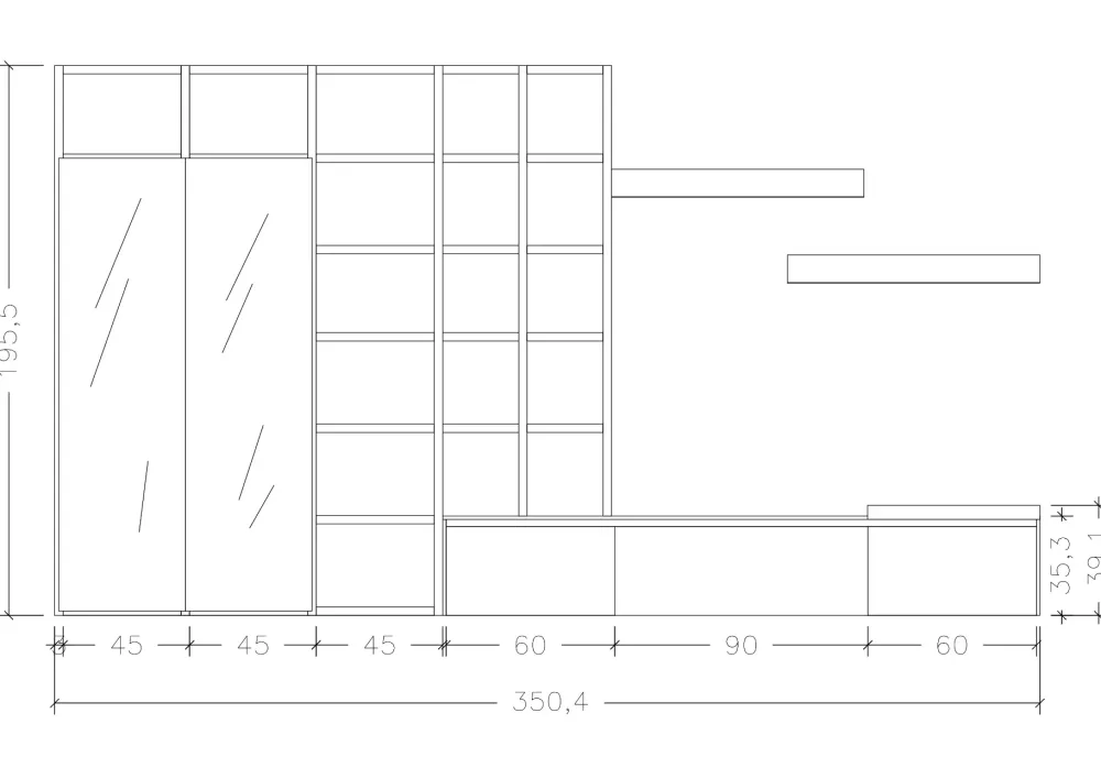 La dimensione della parete è l. 350,4 x p. spalla 37 / p. basi 52 x h.196.