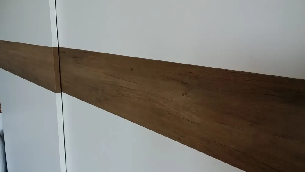 – armadio a 2 ante scorrevoli in finitura mt. opaco bianco con inserto orizzontale in mt. nodato chiaro, struttura in tamburato con finitura interna in tramato, spalle spessore 25 mm., ripiani spessore 40 mm. attrezzatura interna : n.2 ripiani, n.4 tubi appendiabiti e n.4 cassetti, misure d’ingombro cm. 280x67prof.x258h.