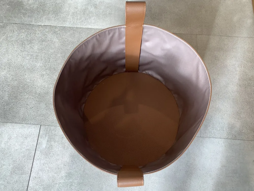 Dimensioni: ø 40 cm ; H 30 cm Cesta realizzata in morbida Pelle Frau SC 67 Chiodi di garofano, lavorata a mano da esperti artigiani. Al corpo della cesta sono cucite maniglie dello stesso rivestimento . La parte interna è rivestita in tela jacquard di poliestere colore beige. Il fondo è in Pelle Frau nella parte superiore a vista e in tela Jacquard Poltrona Frau colore carbone nella parte inferiore. Presenta un bordino perimetrale nero sul fondo che funge da antiscivolo.
