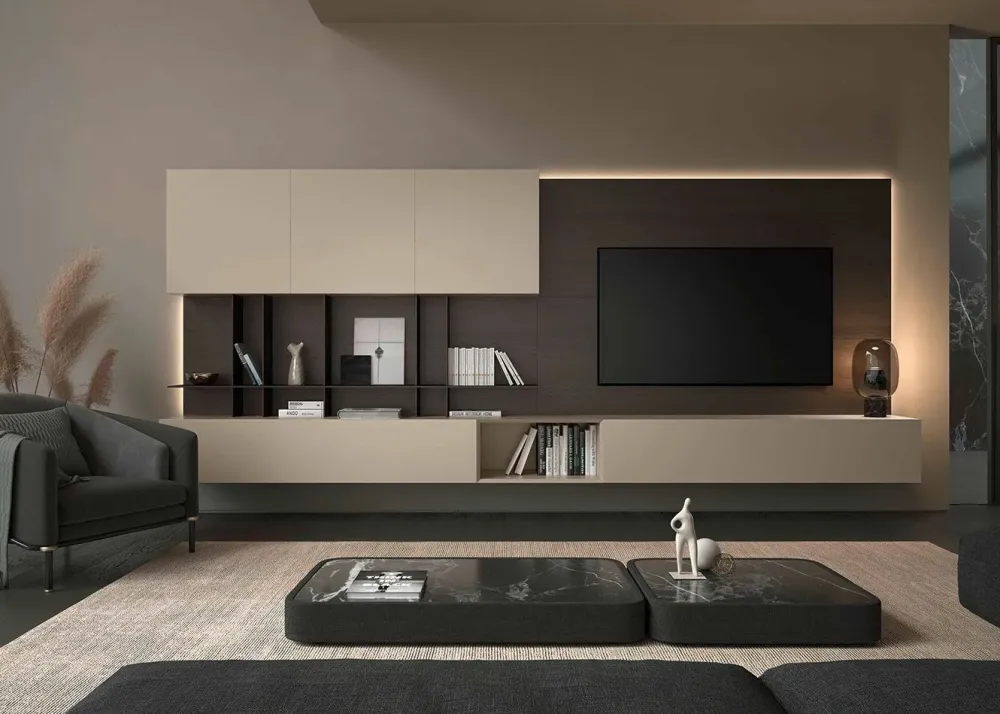 La composizione per la zona giorno qui visibile è costruita in materiali pregiati e che resistano nel tempo: questo modello, in particolare, è in laccato opaco.