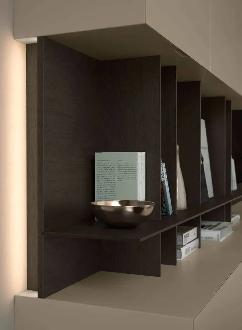 Se desideri ultimare la zona giorno con una parete attrezzta senza maniglia, il modello Cube 6 mostrato in foto fa per te.