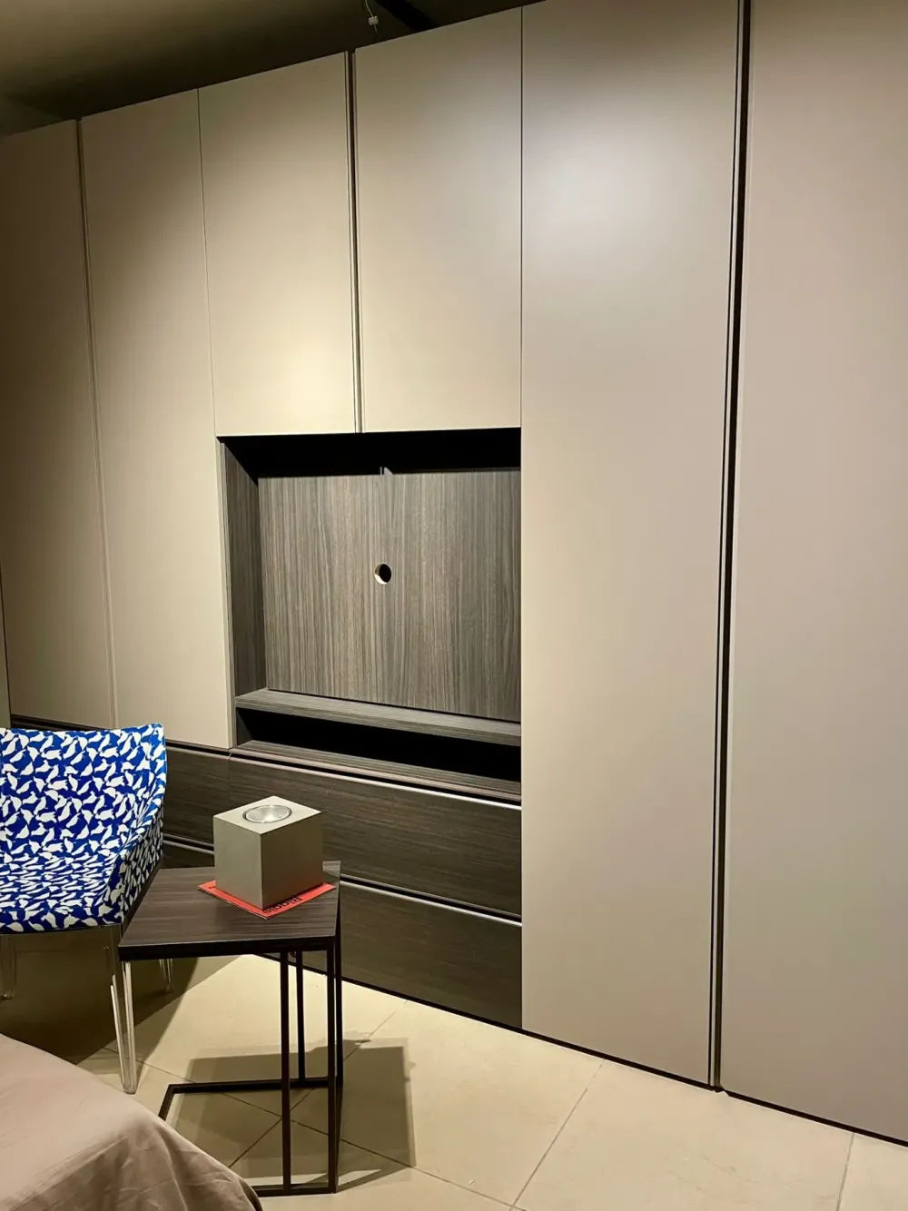 Armadio Novamobili modello Night Collection, colore Ecrù con inserto in legno eucalipto, porta tv. Dimensioni L 292,5 x H 259 x 58,2 cm.