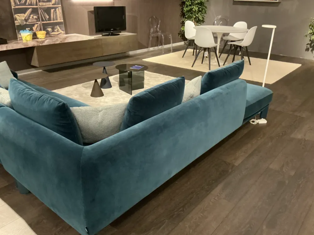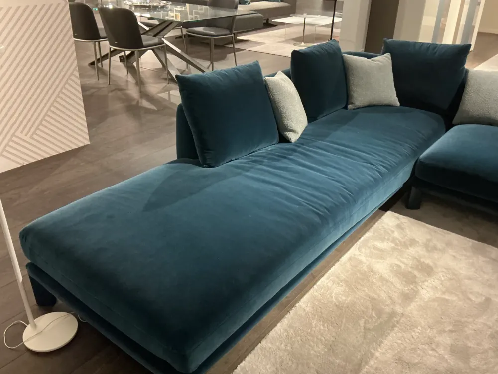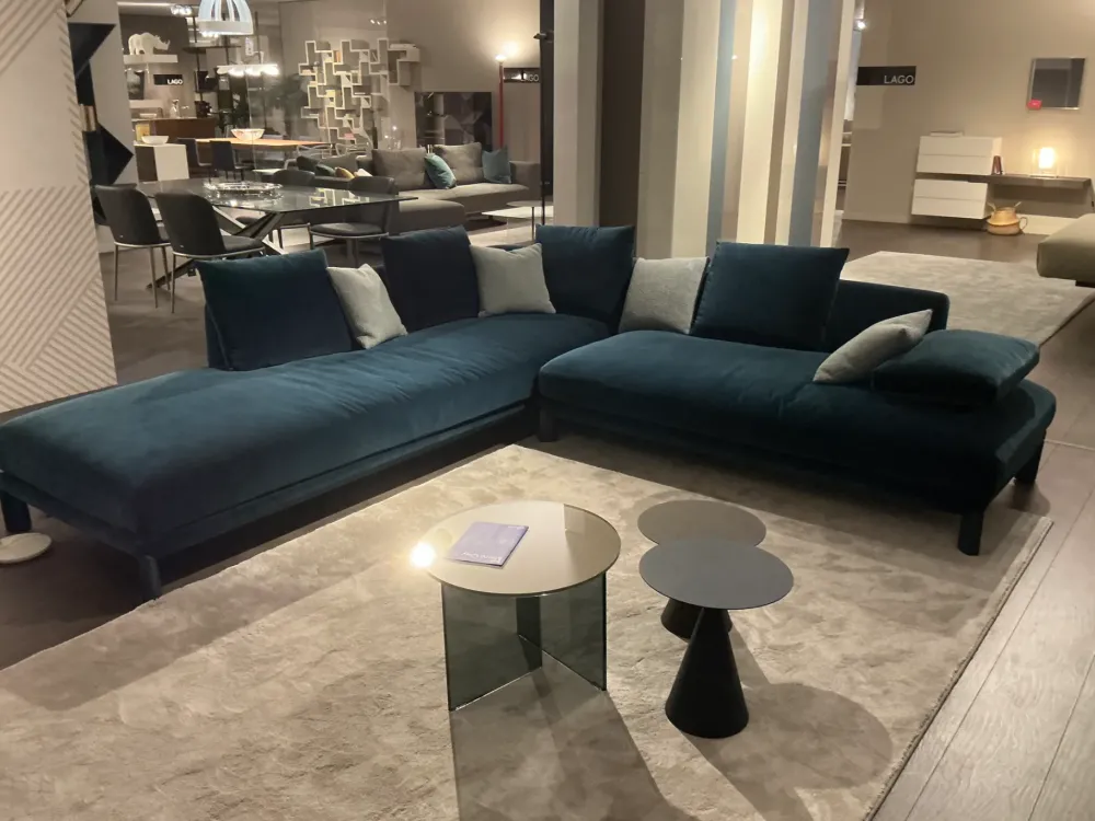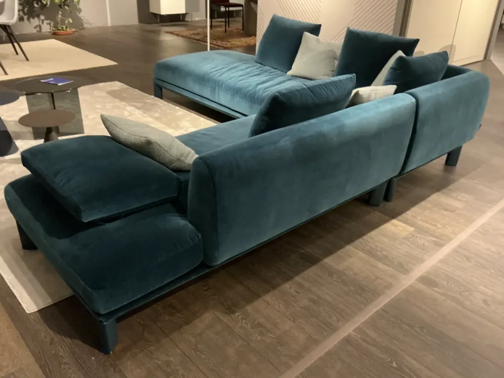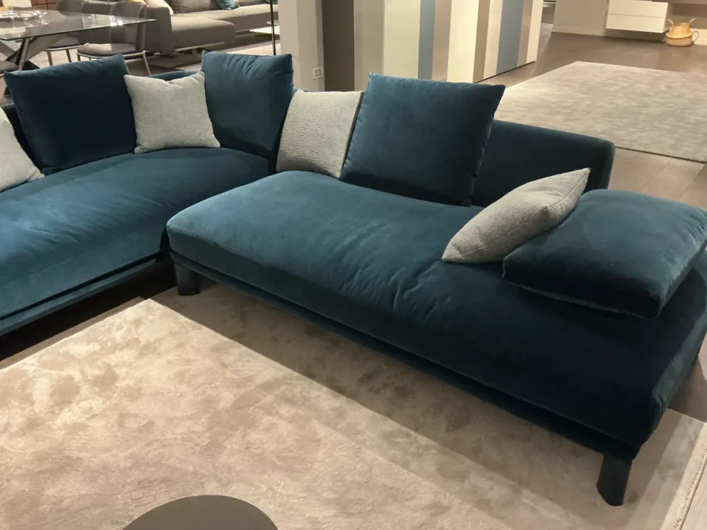 Super occasione! Divano Altana di Lago angolare sfoderabile L. 270×275. Rivestimento in bellissimo tessuto vellutato blu ottanio completo di cuscini come foto.