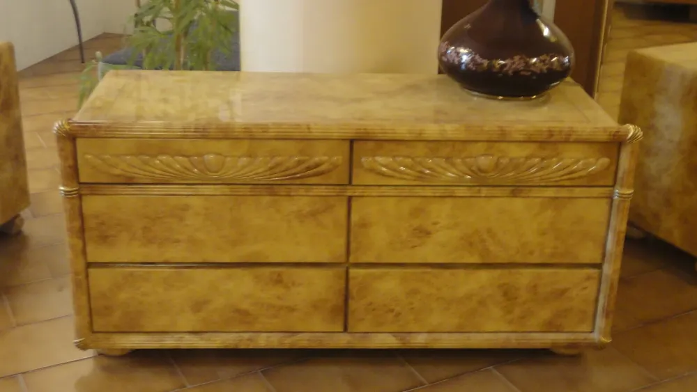 Sia la struttura ed i frontali cassetti sono in finitura radica lucida.