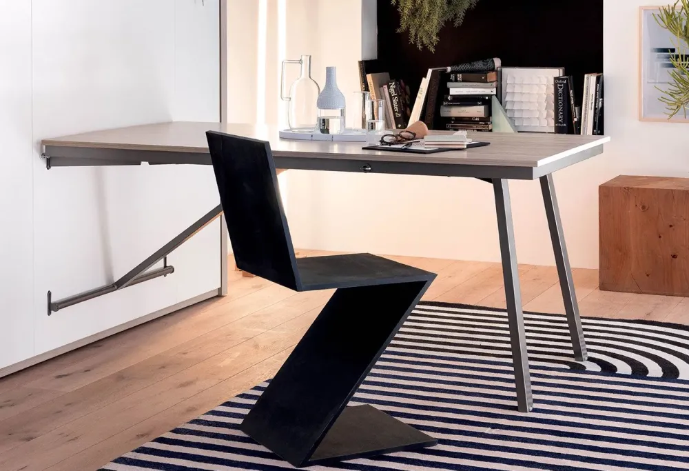 Aprendo il pannello frontale centrale un piano in melaminico diventa un pratico tavolo ad uso scrivania; aprendo l’intero frontale, invece, Ima svela un letto matrimoniale ideale per allestire una postazione notte.