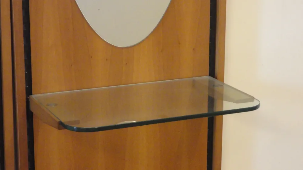 I ripiani sono in totale 3, 1 in vetro trasparente con angoli arrotondati e nella parte superiore abbiamo 2 ripiani in finitura noce.