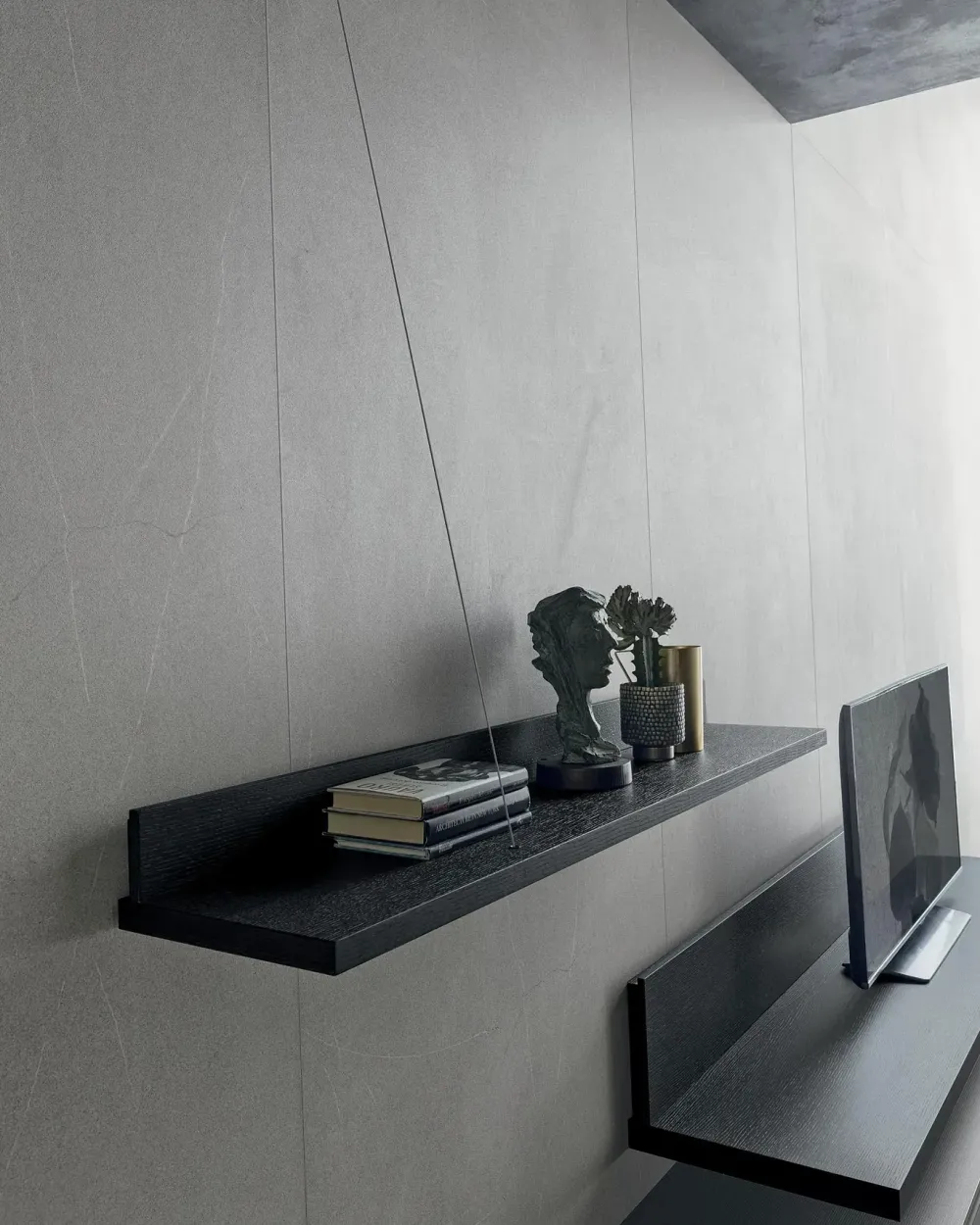 Proponiamo in offerta il soggiorno Tomasella AT103. Misura L 288 – P 30/45/51 – H 140/250 cm Finiture della foto: Materico rovere carbone, materico paglia grigio e metallo antracite. La mensola sembra fluttuare nell’aria ma è tenuta ben salda da un tirante sottile: un gioco visivo accattivante, che sa rendere originale un design semplice. Nonostante la sua leggerezza, la mensola si fa notare. Luci optional non incluse. montaggio da quantificare. Vieni a trovarci presso il nostro showroom, un ambiente utile per offrire spunti, idee e soluzioni per arredare la tua casa, in cui trovare costantemente le ultime novità del settore.