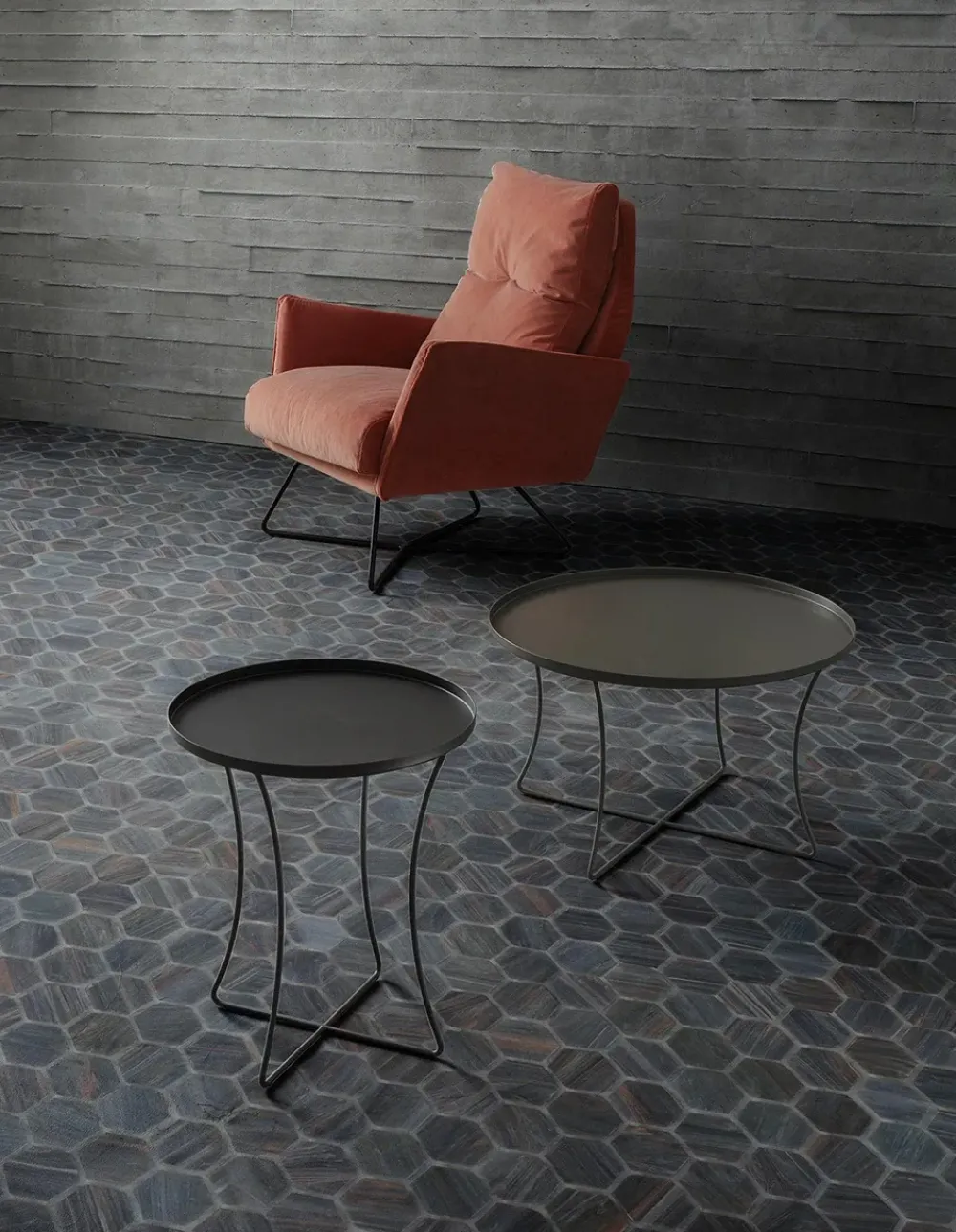 Il set di tavolini MIA è proposto con una finitura in bronzo, che aggiunge un tocco di eleganza senza tempo al vostro salotto. Le sue dimensioni compatte lo rendono ideale per completare l’arredo del soggiorno con stile, senza rinunciare alla funzionalità.