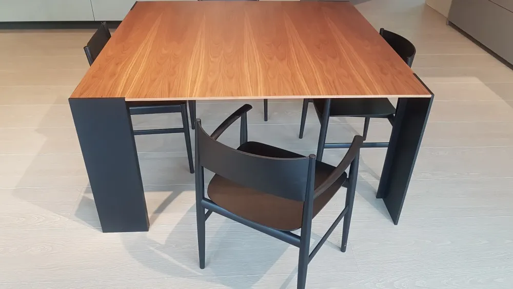Il tavolo “Metallico” di PORRO si caratterizza per la leggerezza di piano in alluminio massiccio rivestito in noce canaletto e gambe realizzate in lamiera d’alluminio nero con spessore 12 mm. L’alluminio massiccio conferisce a questo oggetto solidità e leggerezza, oltre ad essere ecologico. La particolare finitura superficiale, vellutata al tatto ed esteticamente pregiata, viene ottenuta tramite una verniciatura catalizzata ad alto spessore e alle successive fasi di levigatura e ceratura a mano, che ne conferiscono l’effetto materico. Adatto sia per le sale da pranzo che per zone riunione. VERA OCCASIONE per gli amanti del design italiano Dimensioni cm 148 x 148
