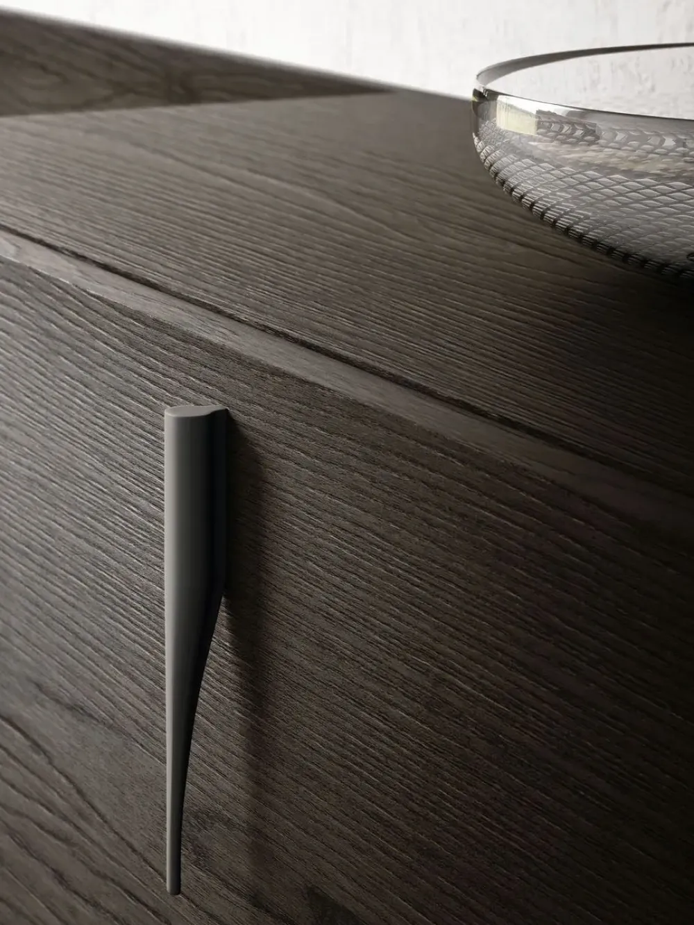 Frassino Carbone, laccato opaco Muschio. Maniglia Piolo, Push-Pull ⁄ Carbone.