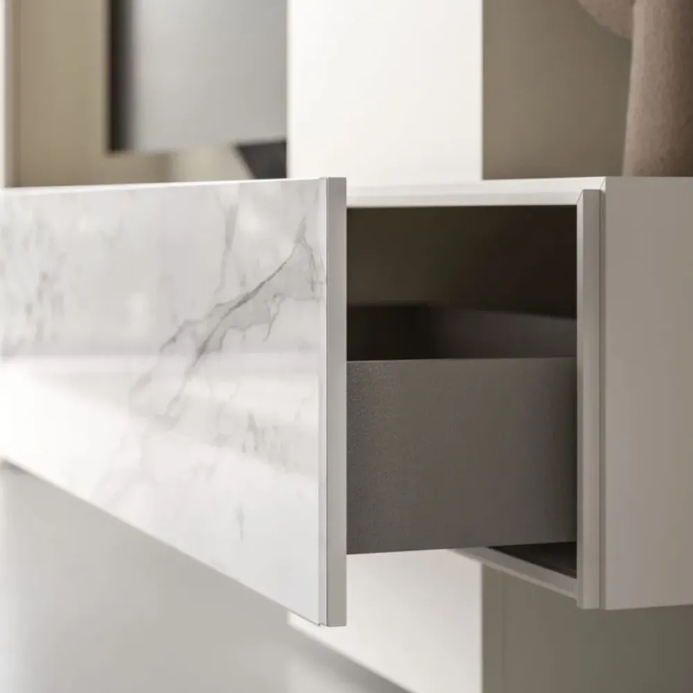 Esempio di soggiorno Day 7 al prezzo esposto come in foto, pensili in materico Seta, cassetti con frontale vetro serigrafato Calacatta Gold, Misura L.4500 H.1768 P.350/478.