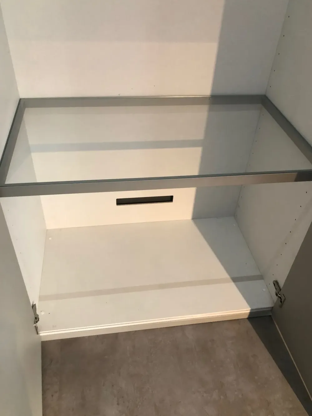 Anta Elegant con maniglia ricavata nello spessore dell’anta, disponibile in tinta o a contrasto.
