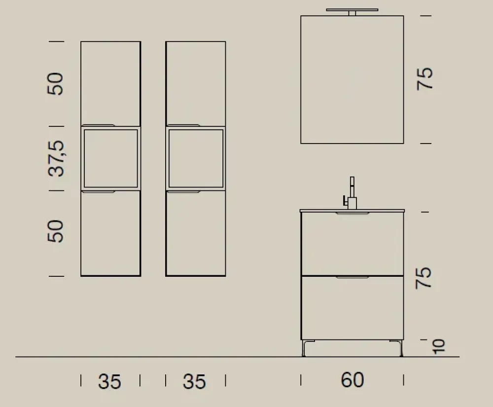 La base portalavabo, oltre alla misura base di 60 cm, è prevista anche nelle seguenti misure: 85 cm, 95 cm, 120 cm (per conoscere i relativi prezzi contattateci).