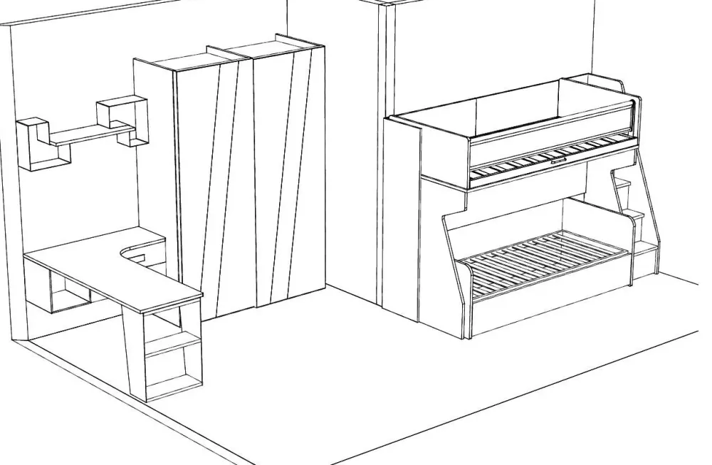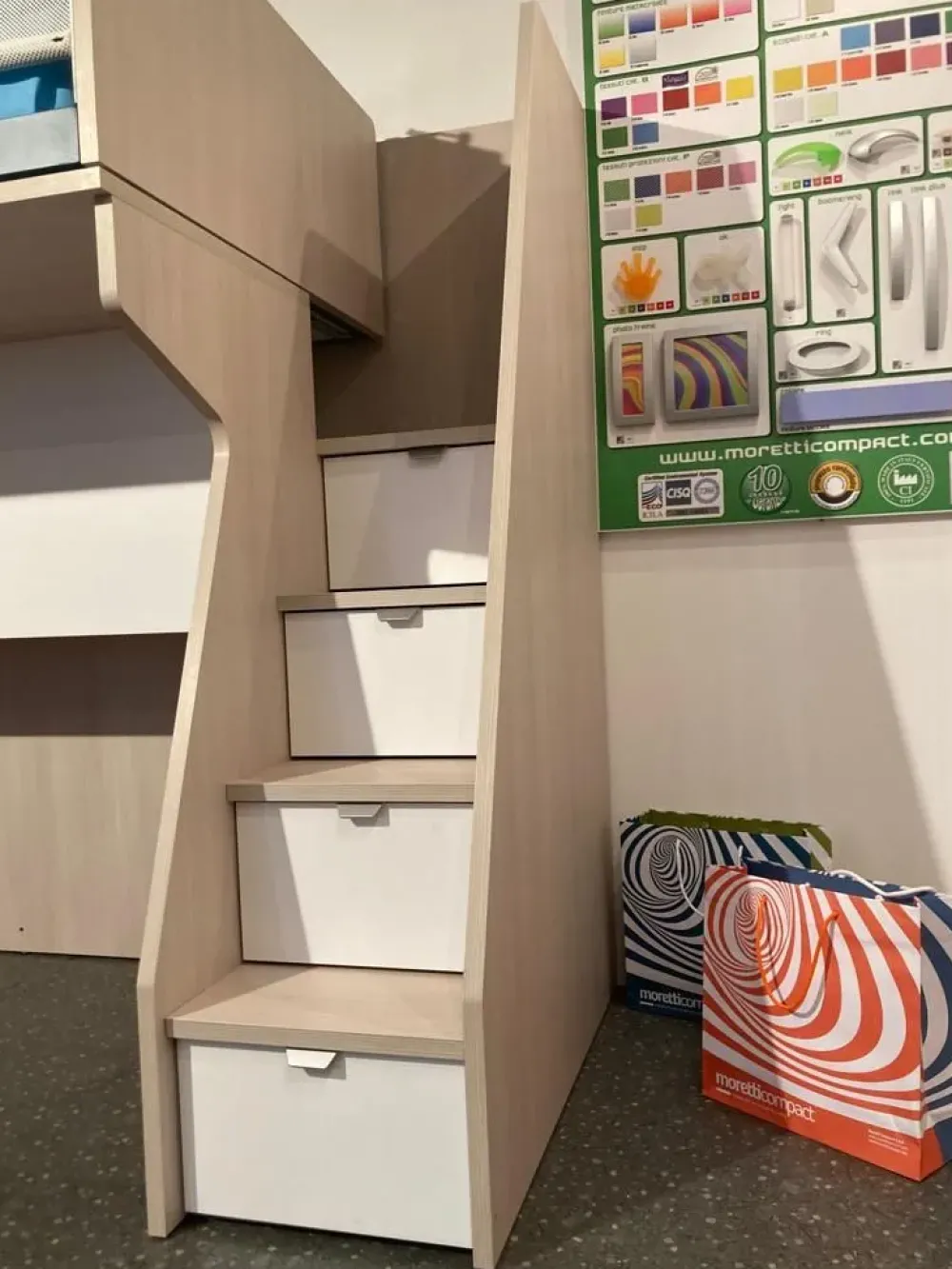 Cameretta Moretti Compact Modello Young composta da: Soppalco con doppio letto, scaletta con contenitori, armadio con ante scorrevoli, scrittoio, sedia girevole e libreria Lbox. Dimensioni Armadio L.155,5 cm H.226 cm P.65 cm