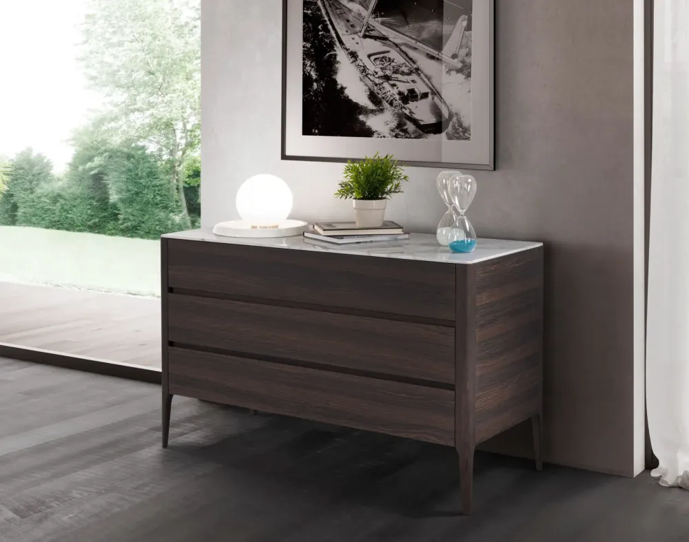 – 01 comò mod. Marie con gola e piede. Finitura struttura ebano scuro, piano in marmo sahara nero. Dimensioni: L 125 P 54 H 81