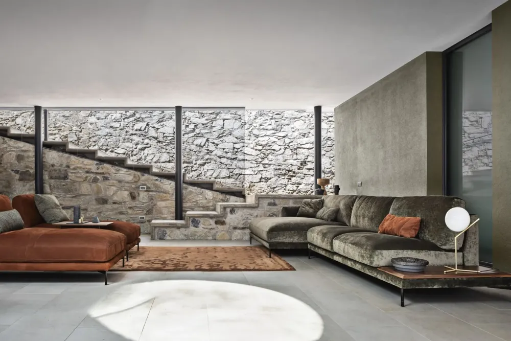 Sedute e schienali imponenti e braccioli dall effetto morbido e scomposto sono abbracciati da una struttura geometrica e lineare, conferendo al Cadorna una sensazione di avvolgente relax.