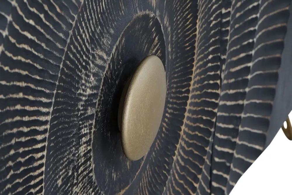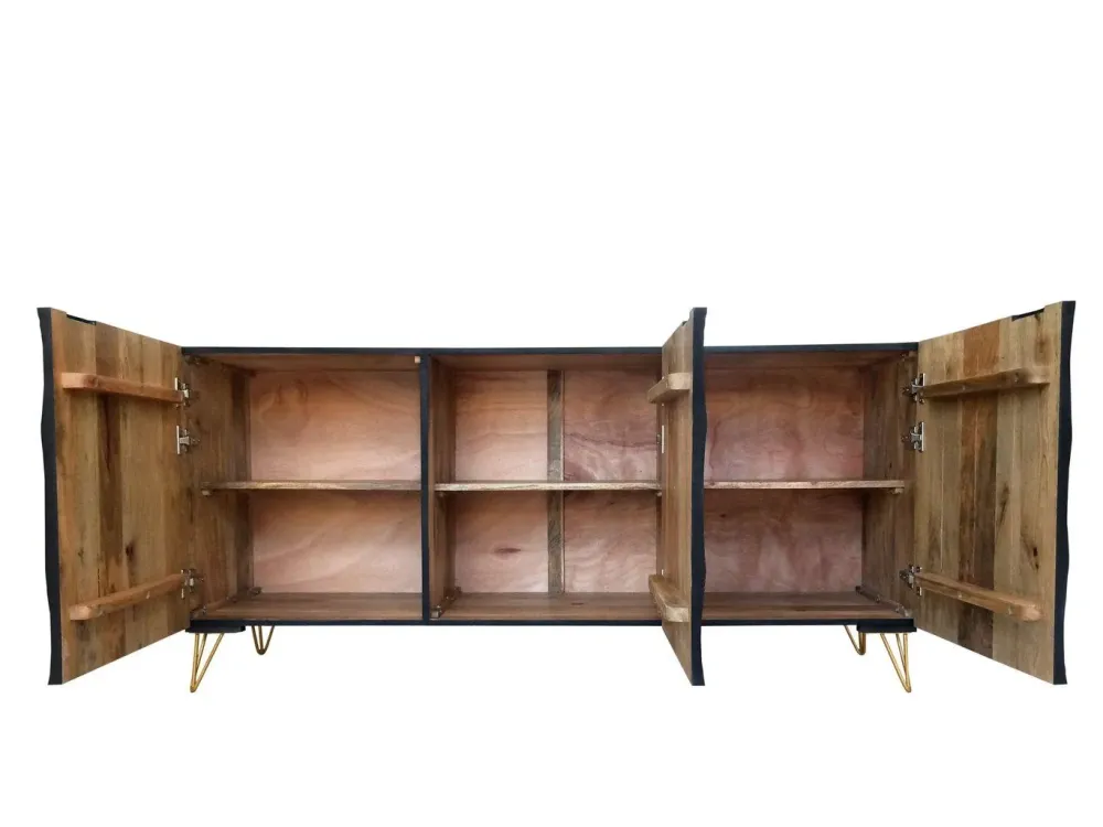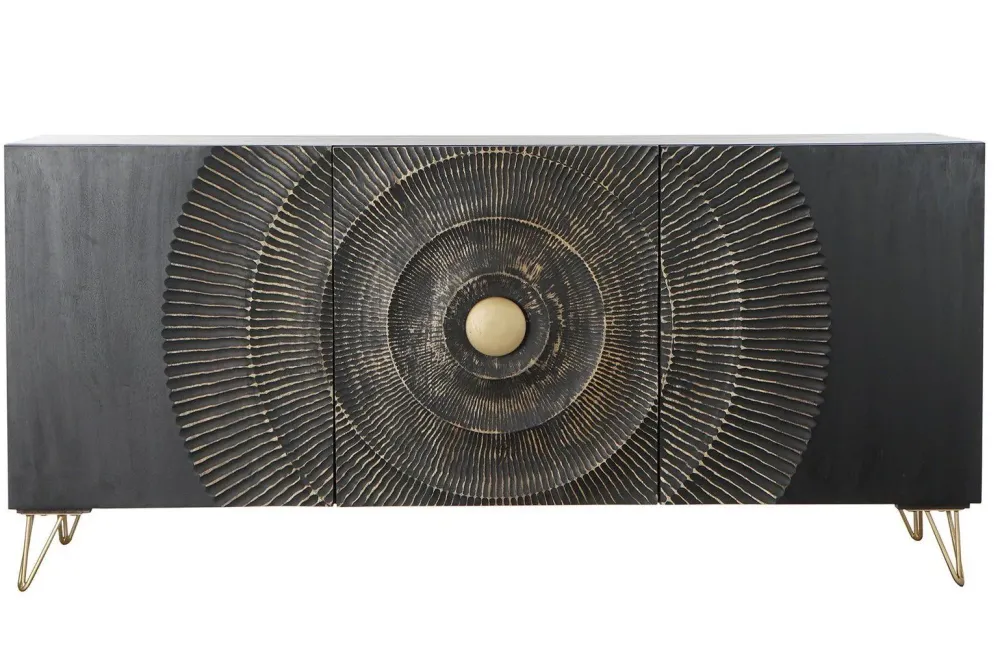 Credenza Mango Nera 160, credenza costruita artigianalmente in legno massello di mango, colore nero con inserti in metallo nel frontale delle ante in colore oro. Composta da 3 ante con mensola interna.
