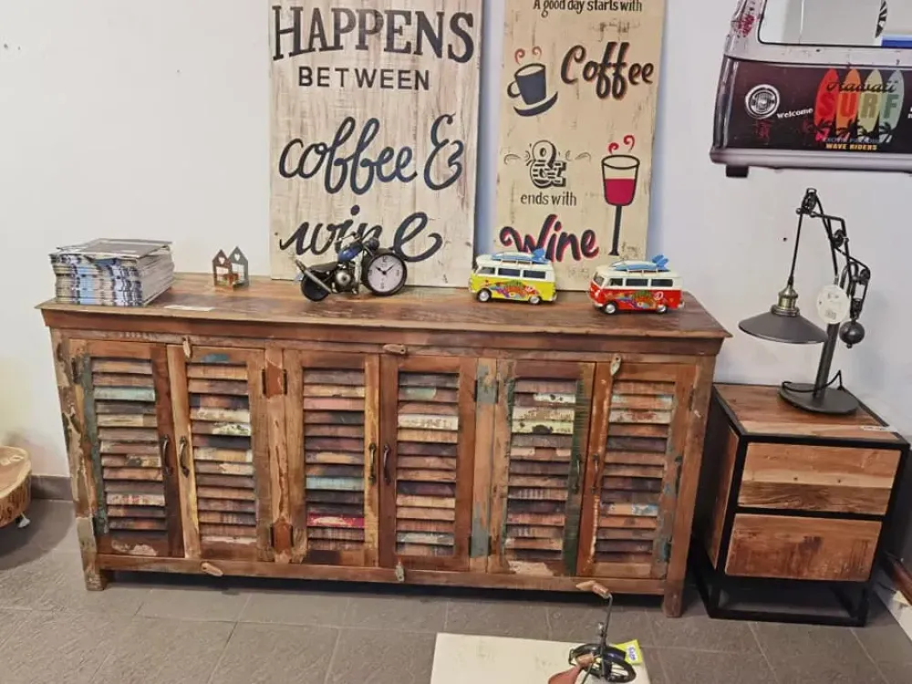 Credenza persiane 180 , ha la struttura in legno massello. E’ composta da 6ante con mensola interna con maniglia nella parte centrale delle ante del mobile. Questa madia ha uno stile vintage – etnico ed è molto particolare grazie al legno riciclato colorato che dona un tocco unico ed originale. pezzi unici e diversi uno dagli altri