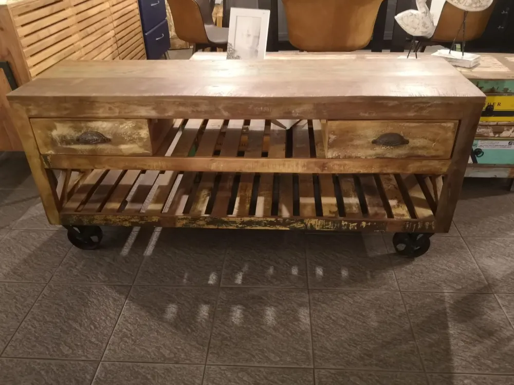 il mobile madia cassetti e ruote industrial misura cm 140 x 45 h 65 questo carrello cassettiera portatv industrial e realizzato in vero legno indiano