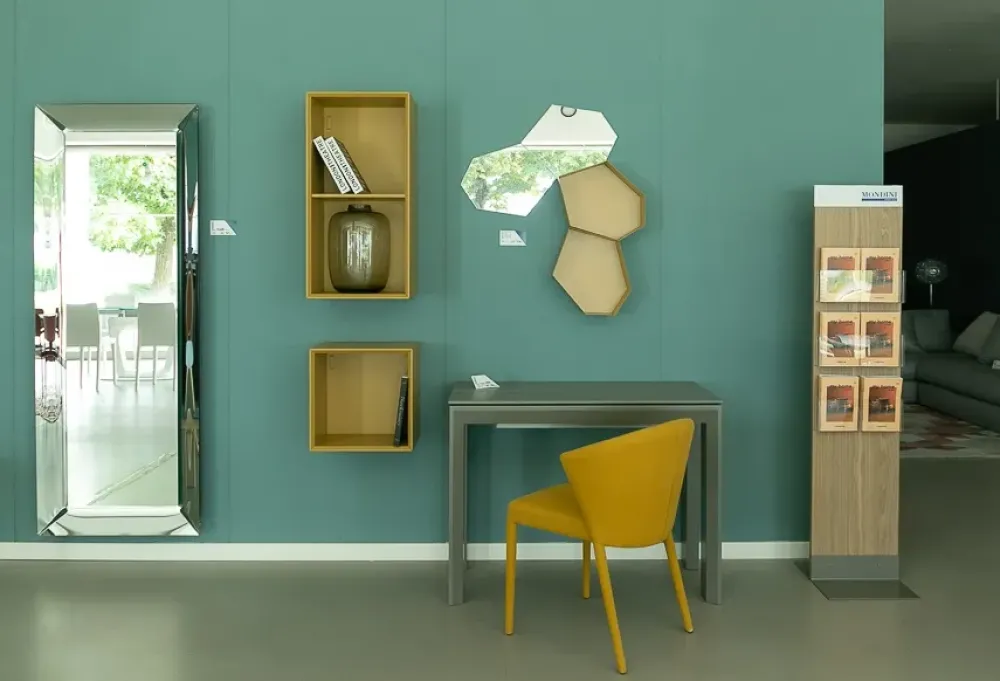 La composizione gioca sui toni attuali del senape abbinati a specchi geometrici. Ideale la composizione con una piccola consolle come in fotografia.