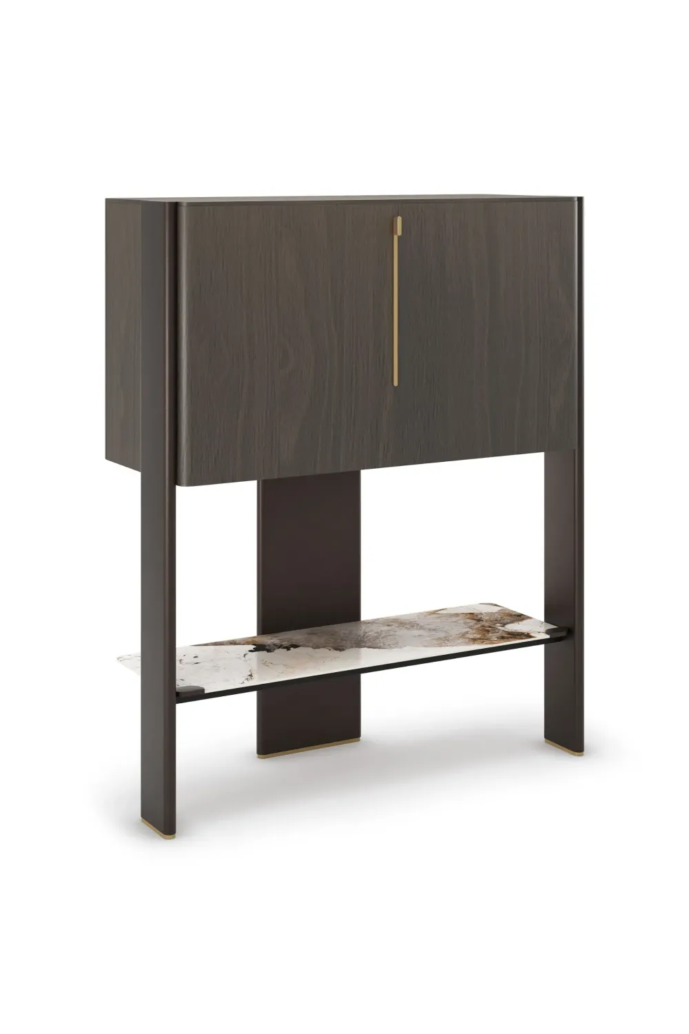 Il corpo della madia, realizzato in legno pregiato, è sorretto da tre gambe dagli spigoli smussati. La particolarità sta nella funzione avvolgente delle gambe, che affiancano il cassone fino alla sua sommità e che sono a tutti gli effetti un elemento decorativo molto presente. Alla base, un sottile bordo in acciaio color ottone si abbina alla maniglia decorativa al centro dell’anta scorrevole, la quale risalta per la sua intensità sul fondo scuro.