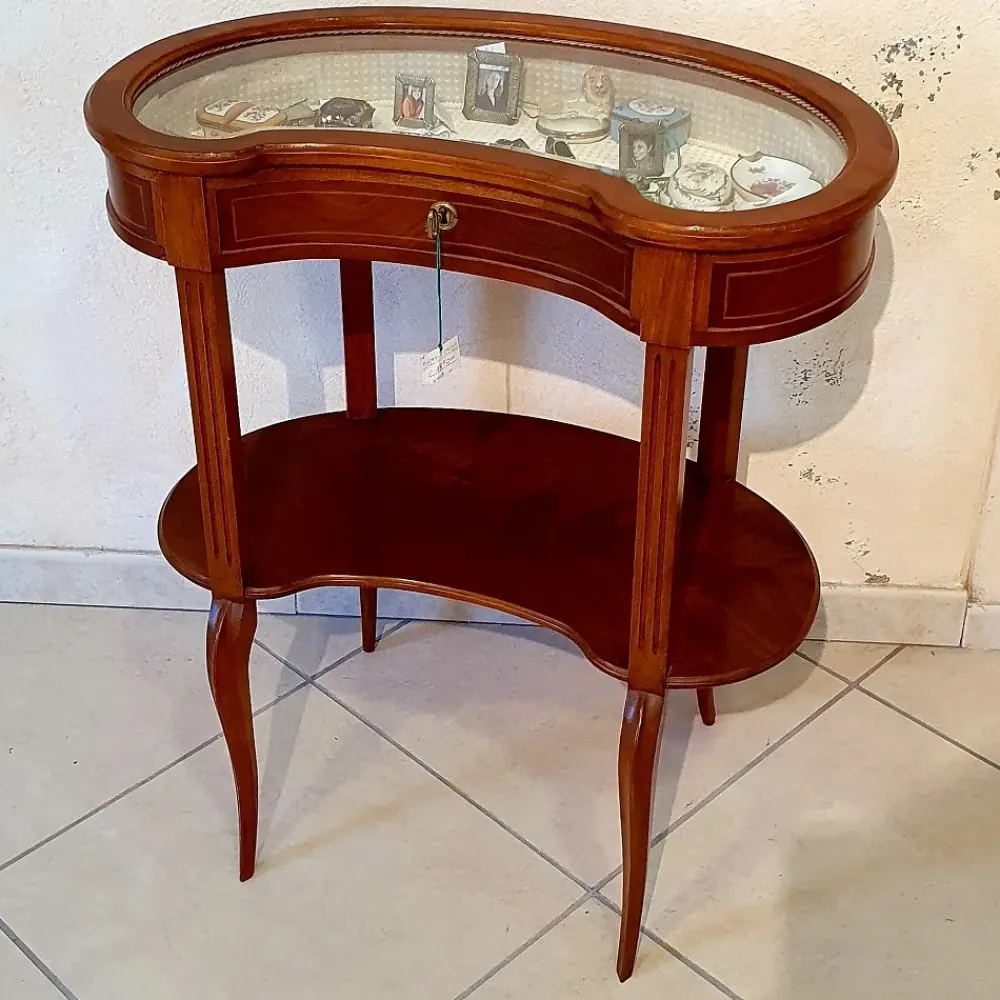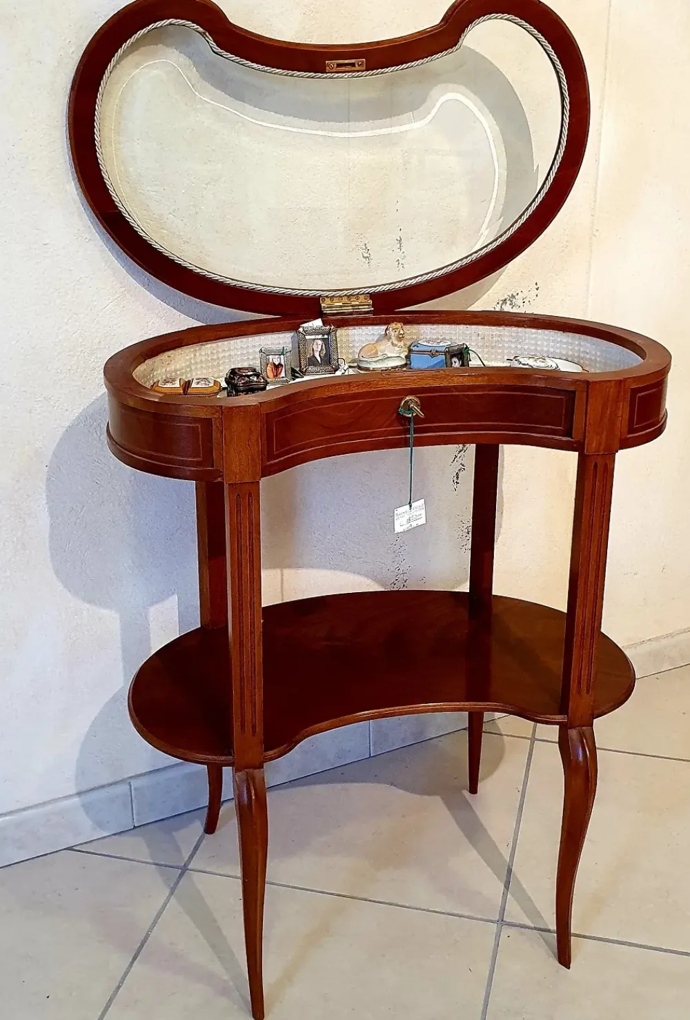 Originale tavolino a bacheca in stile Vittoriano. Le dimensioni sono L. 68 x p. 42 x h. 80 cm. Questa bacheca a forma di fagiolo è stata realizzata negli anni ’70. La struttura è tutta in mogano con piani e fasce in piuma di mogano, i piedi sono lavorati con sottili incisioni e nelle fasce è inserito a riquadro un luminoso filetto di intarsio in acero. L’antina a chiudere incernierata e con chiusura a chiave è fatta con un piano in vetro molato a mano sul bordo, tutto l’interno è rifinito in tessuto chiaro e passamaneria, così da far risaltare quanto esposto all’interno. Come per tutti i nostri mobili, l’imballo è omaggio ed il trasporto escluso, se richiesto, ci appoggiamo e lo preventiviamo solo con corrieri a noi abituali e specializzati in trasporto mobili.