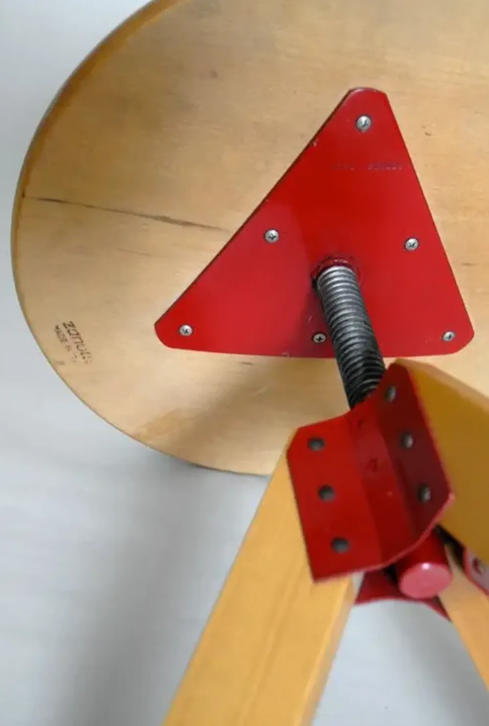 Un grande classico, disegnato ripartendo dagli sgabelli visti tante volte negli studi di architettura. Una struttura costituita da tre gambe di faggio naturale, unite da una crociera metallica verniciata rossa, volutamente esibita, così come ben visibile risulta il sostegno filettato che regge il sedile circolare e ne permette una facile regolazione in altezza. Dim. diam.45 h.45-55 cm.