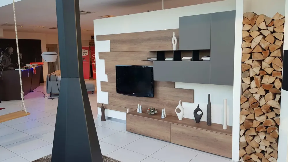 La pannellatura sempre in finitura rovere nodato chiaro che fa da sfondo e sorregge il televisore è caratterizzata da doghe di vario spessore per creare movimento e dare maggiore valore alla parete, inoltre prevede un’intercapedine per il passaggio dei cavi rendendoli invisibili