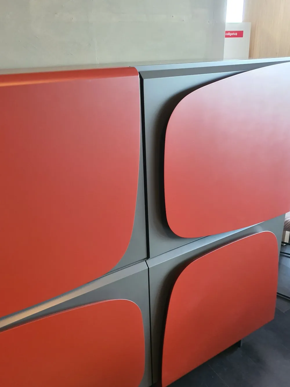 La struttura è in laccato opaco colore ardesia mentre i particolari frontali sono caratterizzati da forme tondeggianti di color mattone. Questi inserti fanno da presa per aprire comodamente le antine