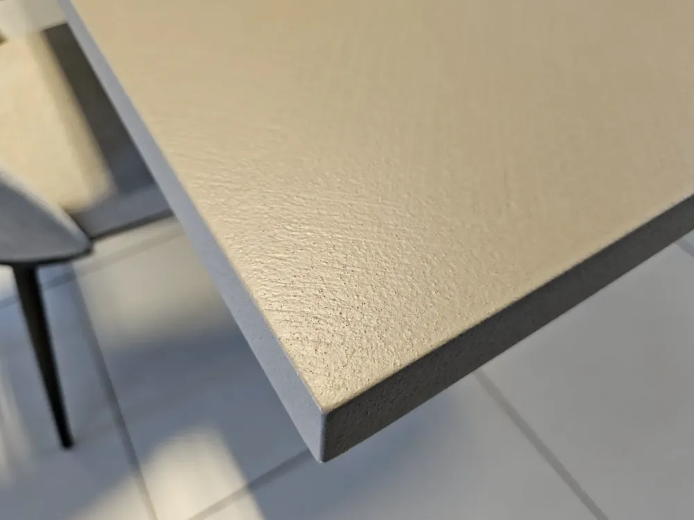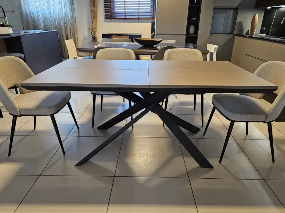 Tavolo allungabile 4×4, sistema unico nel suo genere in quanto si allunga e si allarga nello stesso tempo, piano in finitura cemento tortora CM90, telaio e base in metallo finitura grafite MT98, n.10 posti