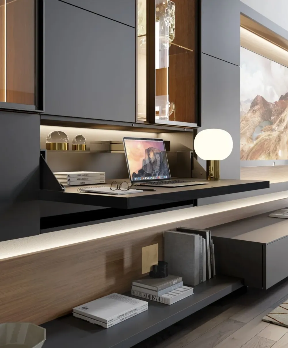 Tra differenti mobili e oggetti accessori senza maniglia, questa soluzione saprà completare il living ottimizzando ogni angolo.