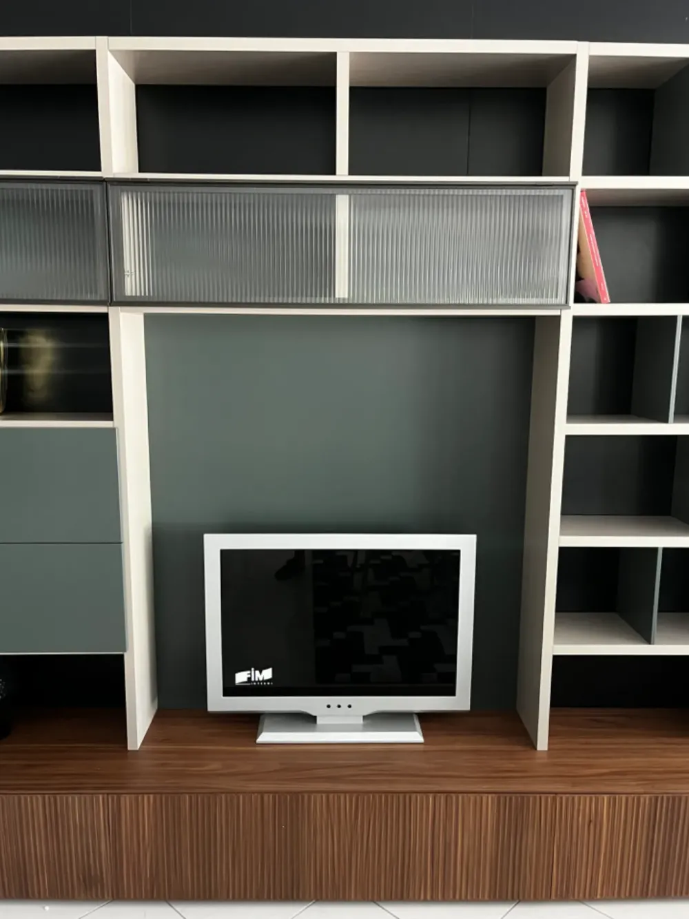 Parete TV attrezzata composta da vani contenimento e libreria. Ante vetrina effetto cannettato rays , che si ritrova sulle ante delle basi cestone con apertura Push pull, in finitura noce Canaletto. Elementi di contenimento con ante laccate opache. La libreria sulla destra presenta tramezze alternate che donano movimento ed eleganza alla struttura. Molto raffinato l accostamento del noce canaletto ai laccati opachi in colori tendenza. La vetrina rays regala luminosità e movimento.