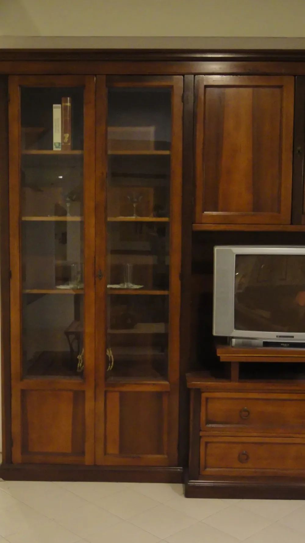 Elemento colonna a 4 ante da cm 93 di larghezza composto da 2 ante inferiori in legno e 2 ante superiori in vetro trasparente con telaio in legno.