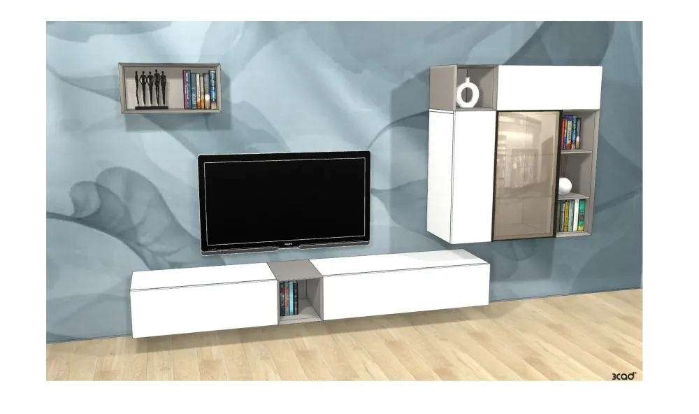 La composizione è completamente sospesa e i mobili possono essere posizionati e gestiti in più configurazioni, il modulo vetrina ha internatmento una luce led.