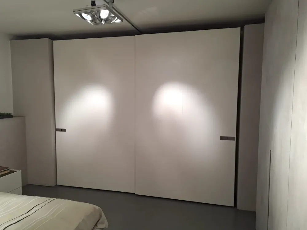Armadio da esposizione , marchio Pianca, 2 ante scorrevoli in laminato bianco opaco, interno laminato noce dorato ,maniglia incasso in titanio, attrezzato con 1 cassettiera 4 cassetti, ripiani e aste appendiabiti, pomello per grucce.