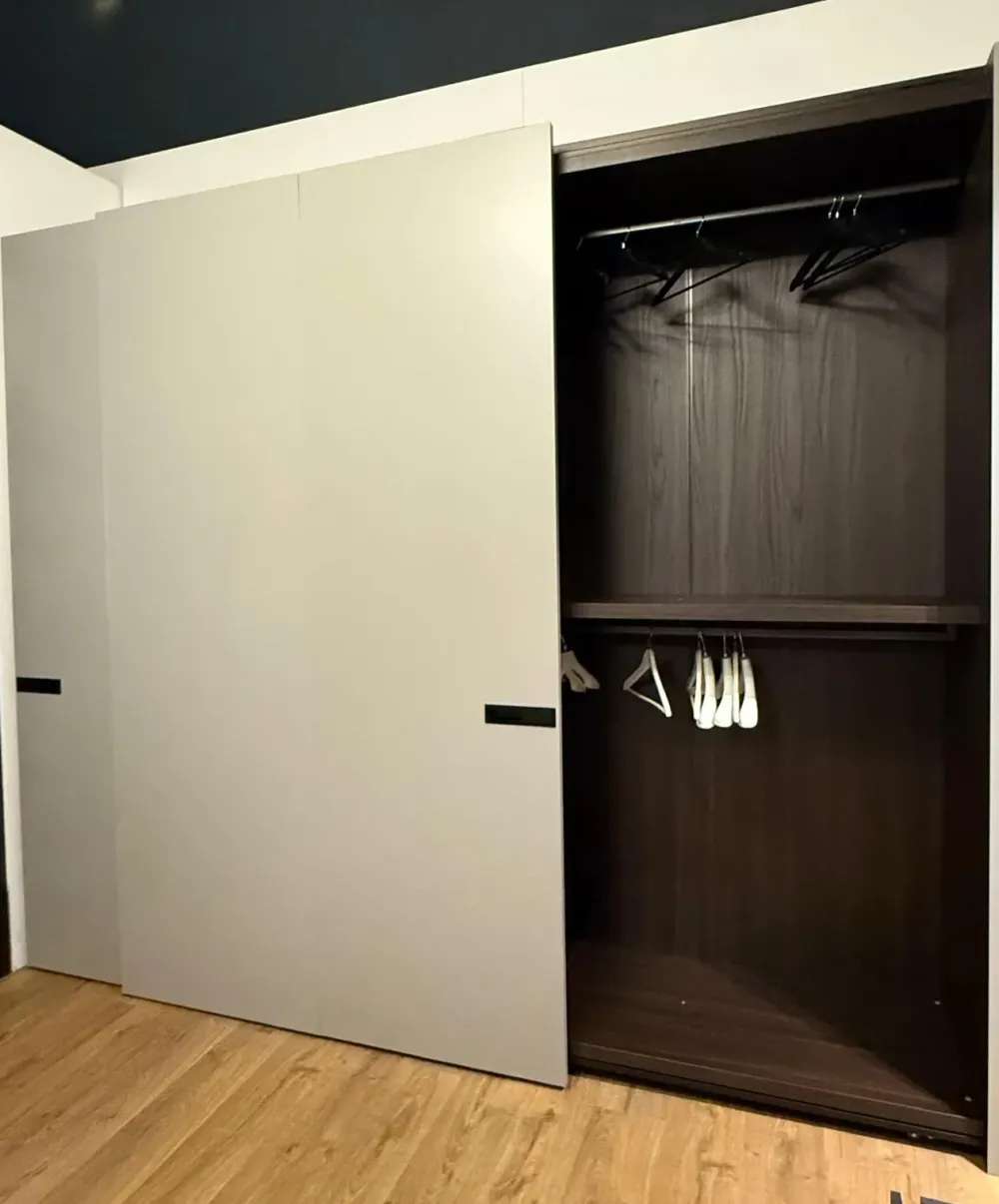 Armadio scorrevole 2 ante in finitura laccato oparo roccia e interni materico rovere borgogna, con maniglia icona titanio lucido.