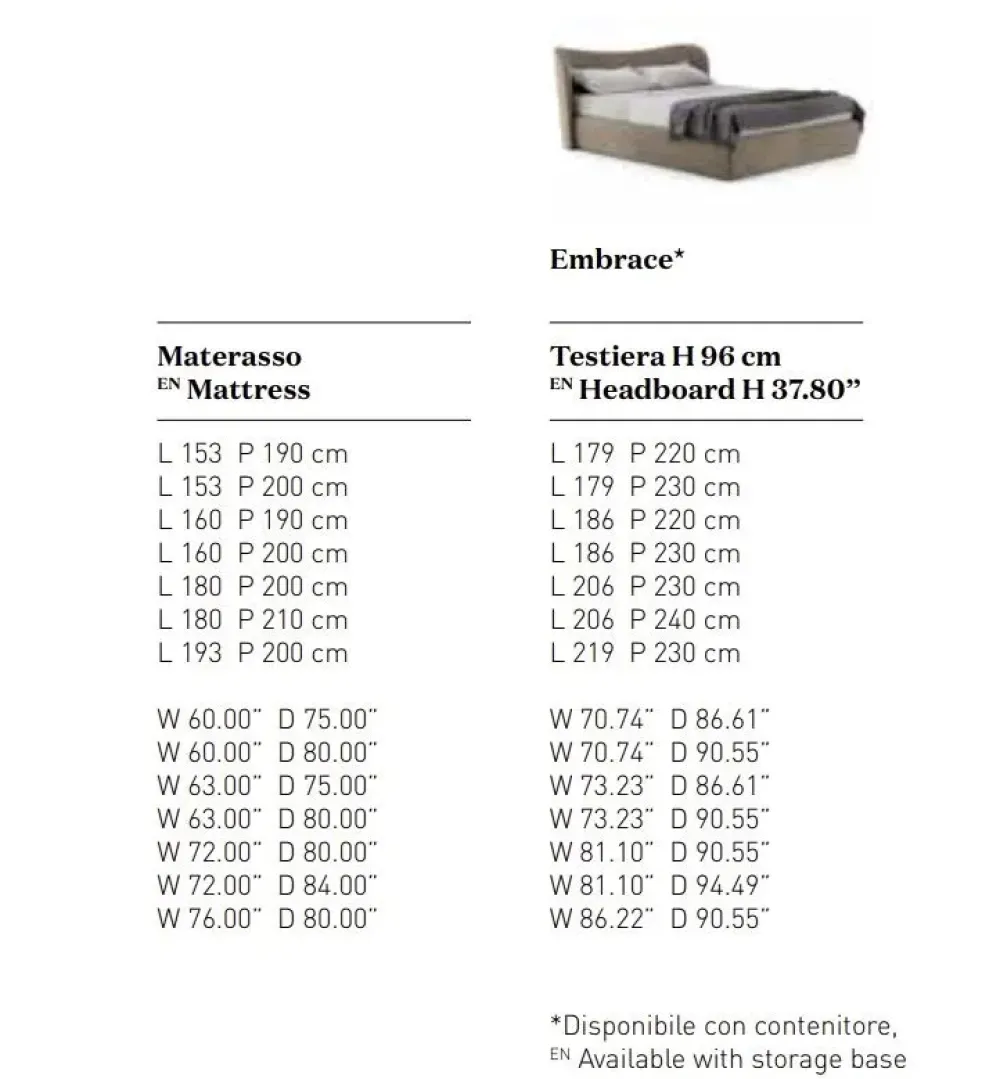 - Questo letto Matrimoniale Embrace non prevede nessun materasso: non per questo dovrai rinunciarvi, infatti potrai riceverne su richiesta uno e riceverlo con un supplemento.